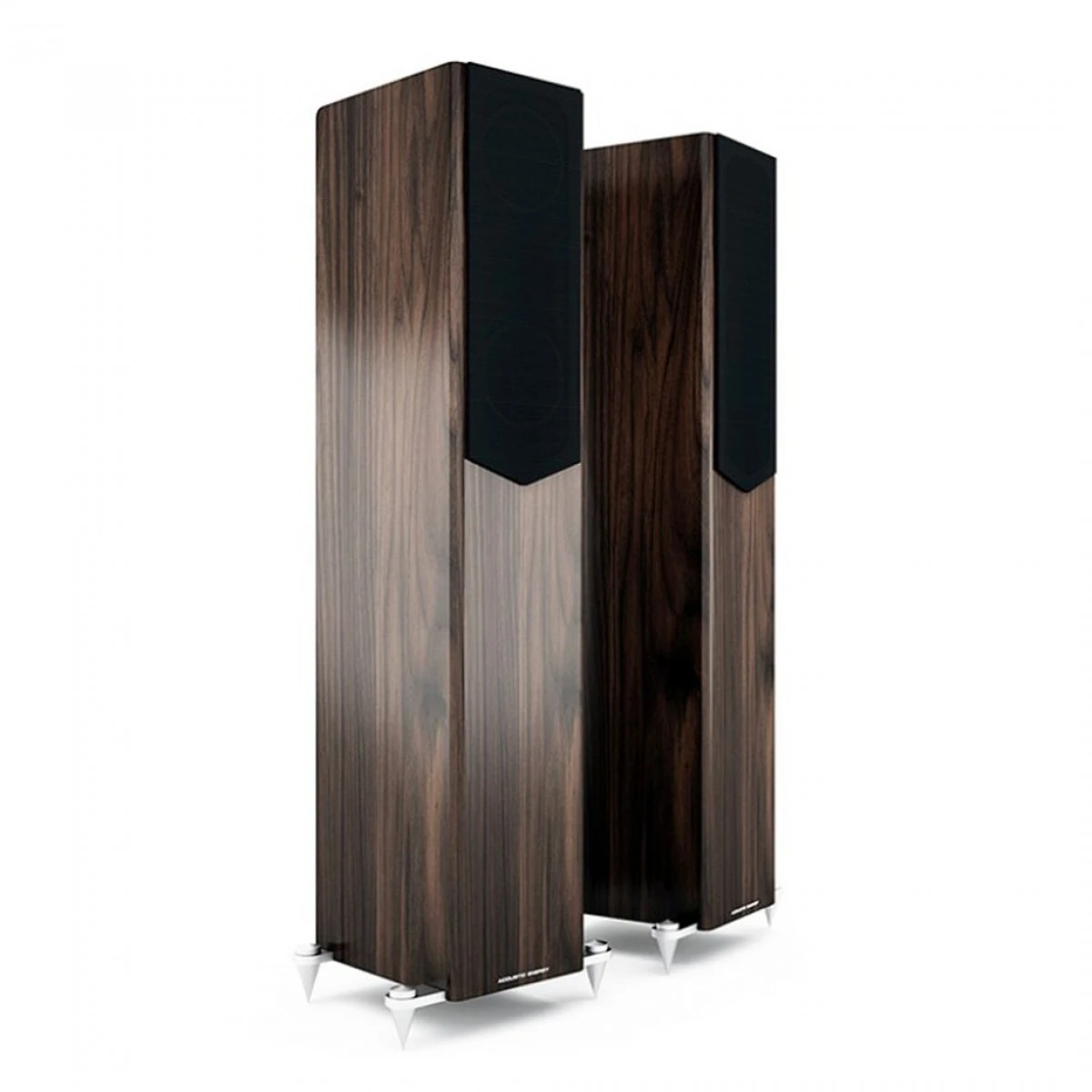 The slim-line cabinets are finished in Piano Gloss Black, Piano Gloss White or American Walnut wood veneer finishes. Solid Aluminium bars are supplied to ensure rigid floor-coupling and maximum stability, whilst the stiffness of the metal structure reduces the room to speaker interaction.