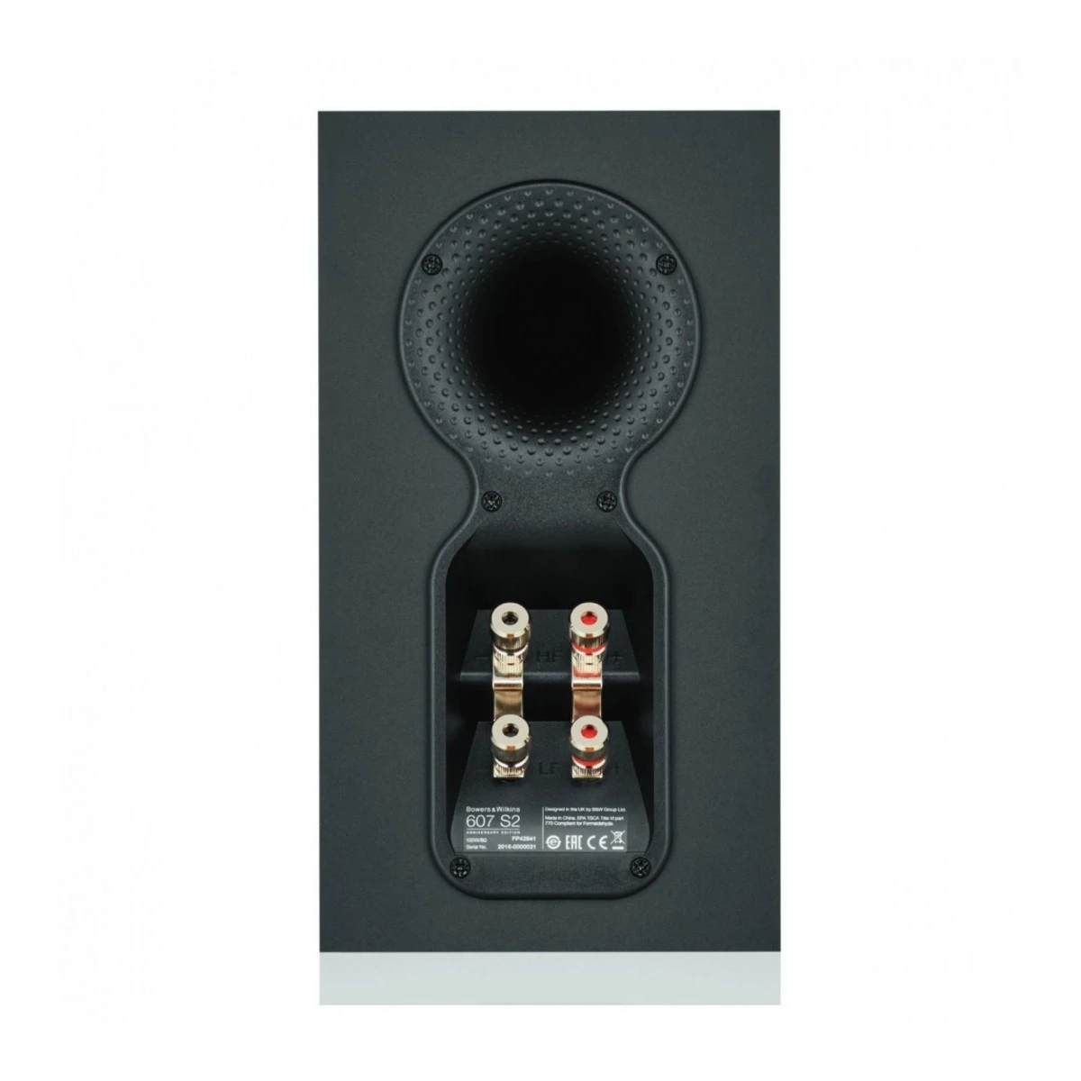 The final key innovation of the Bowers & Wilkins Anniversary Edition speakers is the eye-catching design of their rear-facing bass reflex, known as the Flowport™. The design uses the same principles as a common golf ball, with the dimpled pattern reducing turbulence as air is pushed from the cabinet—a simple addition to greatly improve performance. The speaker is also supplied with a double cylindrical foam bung, letting you tighten the bass response to your liking.