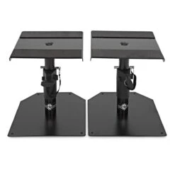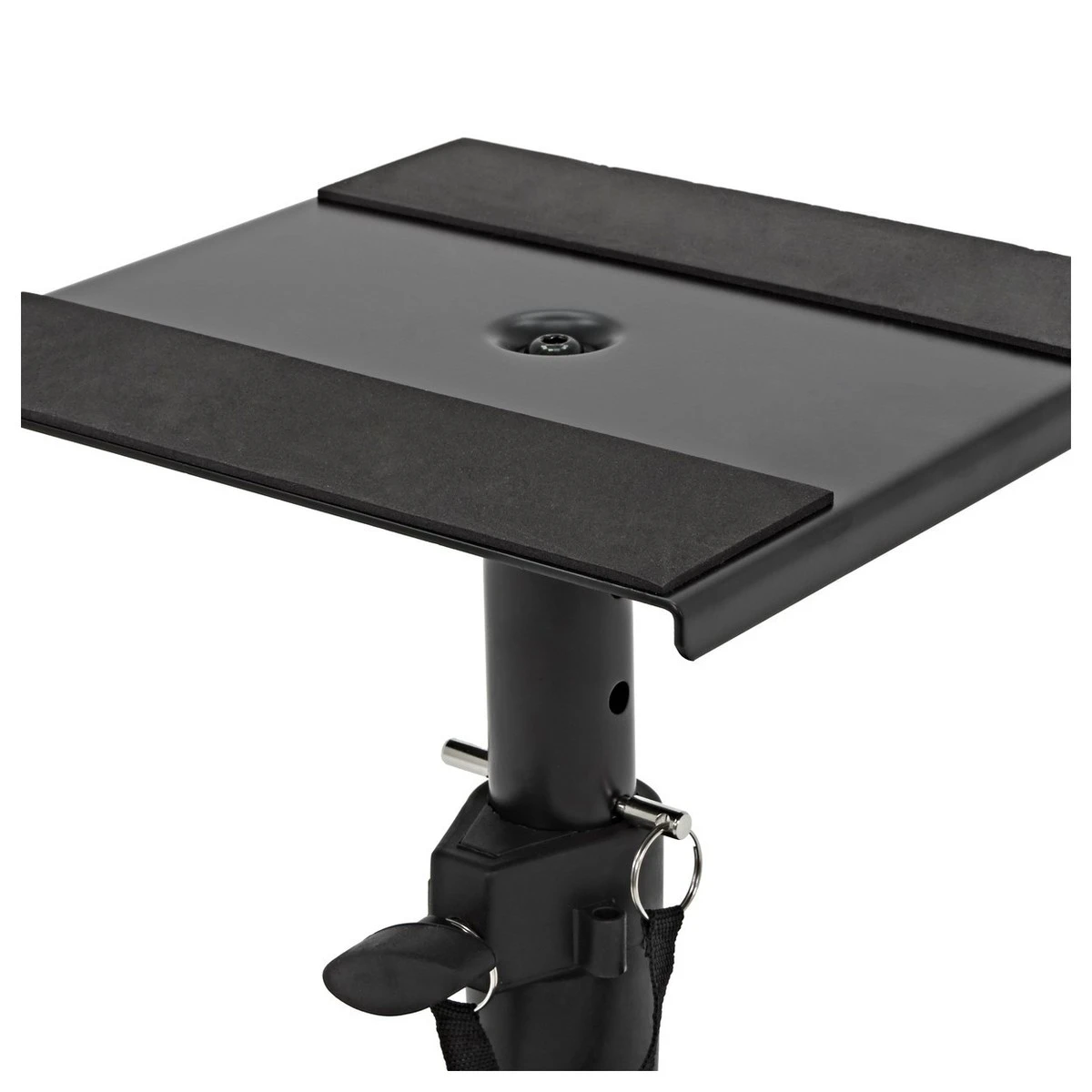 Desktop Monitor Speaker Stands by Gear4music are a perfect accessory to raise all types of studio monitors to ear height for an improved sound. With non slip rubber feet mounted to a sturdy base, even heavier monitors can be held securely on the rubber covered top plate. The height adjustable pole with safety rod makes it ideal for small and large monitors alike.