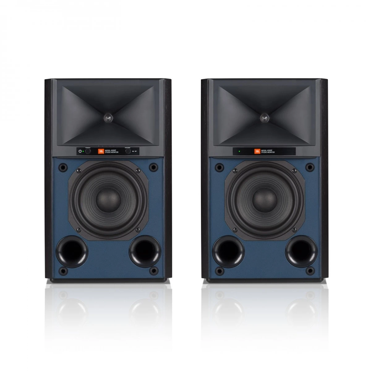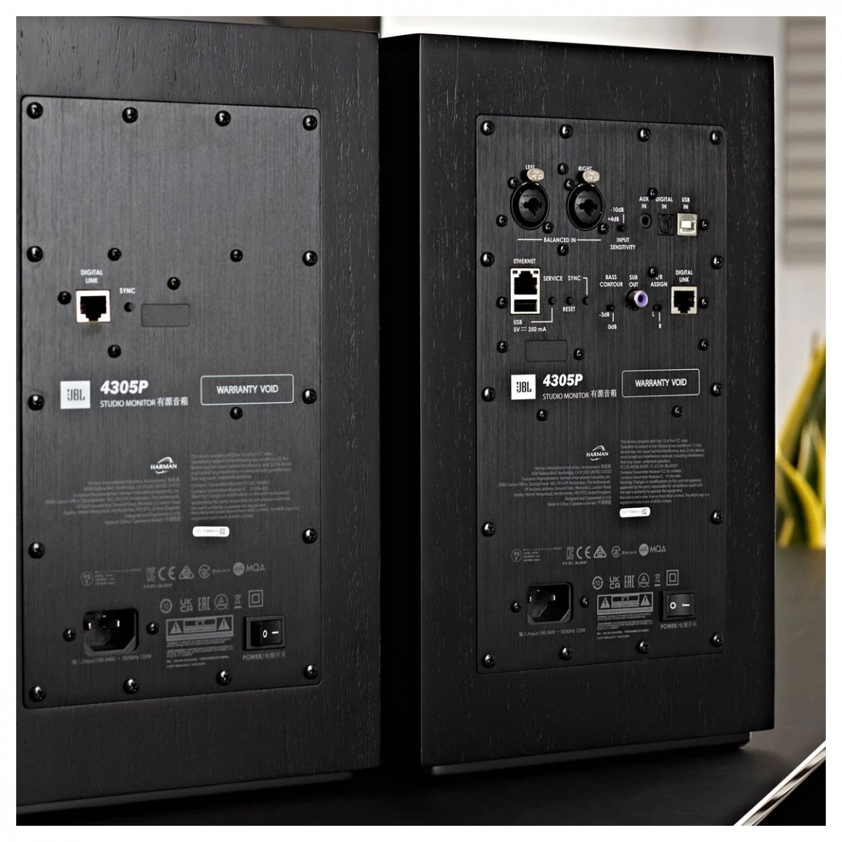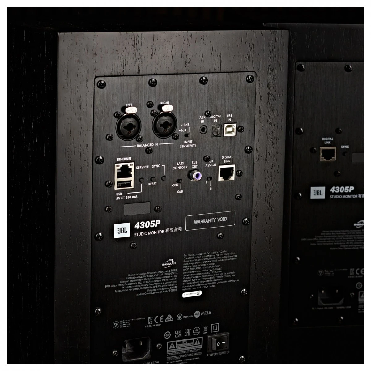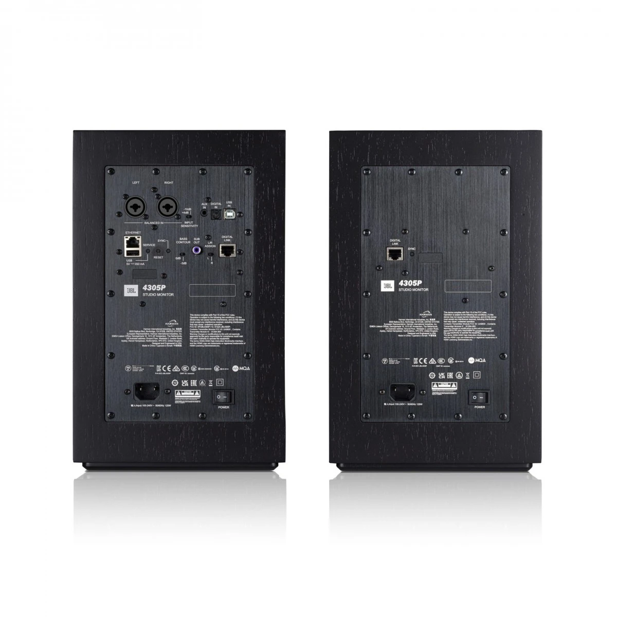 Type Active 2-way Bookshelf Loudspeaker Low-frequency driver 5.25-inch fiber composite woofer High-frequency driver 2410H-2 1-inch with Advanced HDI Geometry Horn Amplifier type Class D, 130W Peak (300Wrms total system power) Inputs XLR, 1/4″ phono (selectable between balanced and unbalanced), asynchronous USB, optical, 3.5mm jack, ethernet Outputs Subwoofer DAC 24-bit/192kHz high-resolution Product code JBL4305PBLKEU