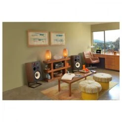The 1-inch titanium dome tweeter is mated to a wave guide with an acoustic lens for optimum integration with the 5-inch pure-pulp cone mid range driver directly below it. Powerful bass is provided by a 12-inch cast-frame, white pure-pulp cone woofer in a bass-reflex enclosure, tuned via a single front-firing port tube.The high-frequency and mid-frequency L-pad attenuates on the front baffle preserve the classic features of this iconic legend.