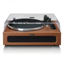- Classic belt-drive turntable design with built-in speakers