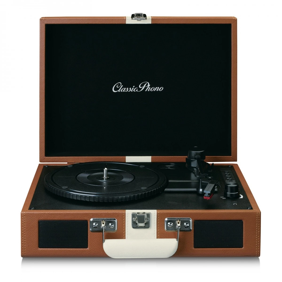 Not only can you play vinyl records, the Bluetooth and AUX connectivity means you can also play songs directly from a smartphone, tablet device or an MP3 player. It provides the ability to play records at 33 and 45 RPM, as well a 78 RPM setting for 7-inch vinyl records. The two built-in loudspeakers provide high-quality audio fidelity at impressive volumes. It comes with everything you need to play you records, right out of the box. The exterior is constructed from an MDF cabinet with a P.U leather finish. It even features an RCA jack and line input should you want to hook the turntable up to your own speakers.