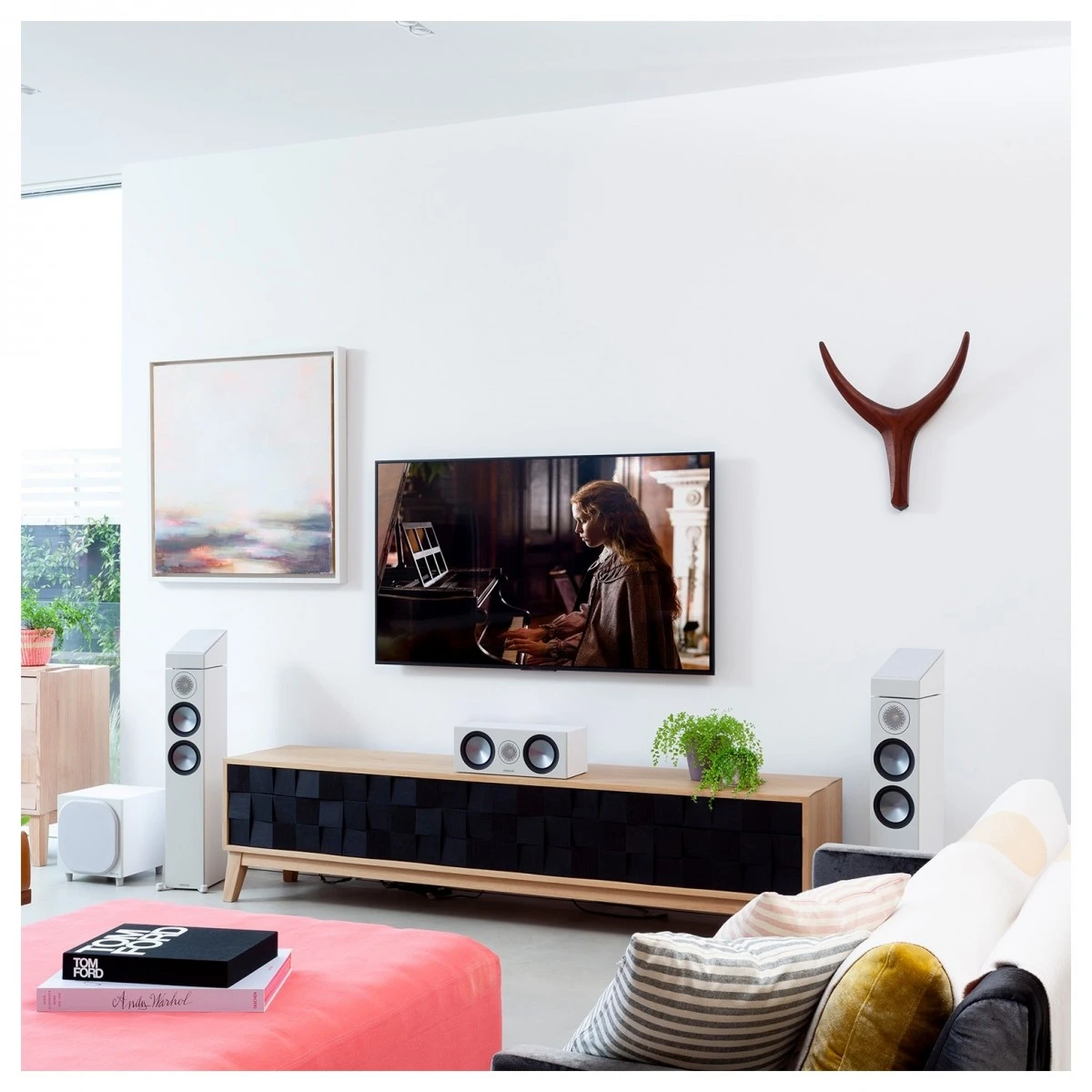 - Two 5 1/2-inch mid-range drivers create a balanced, cinematic sound