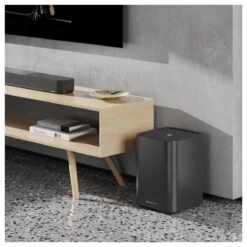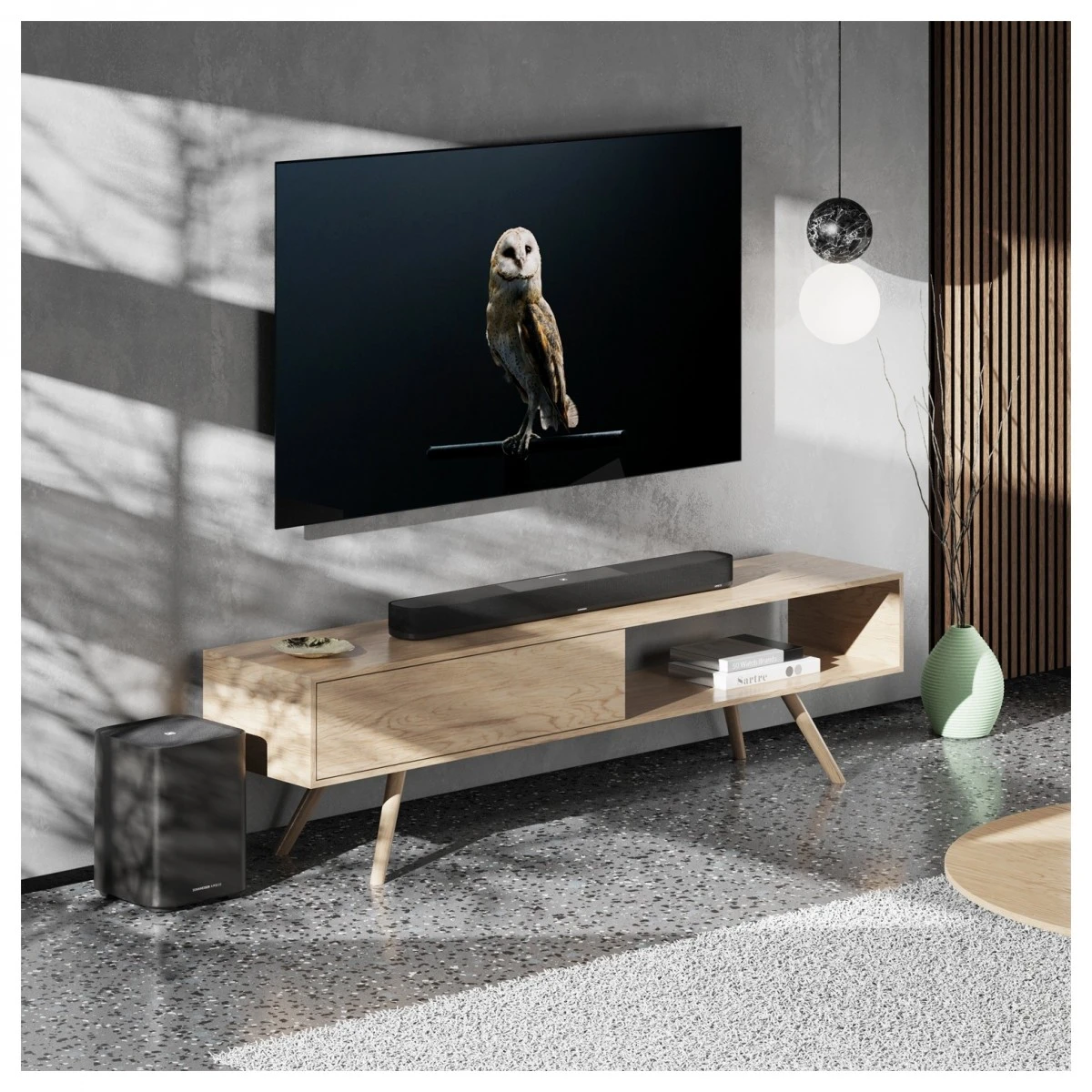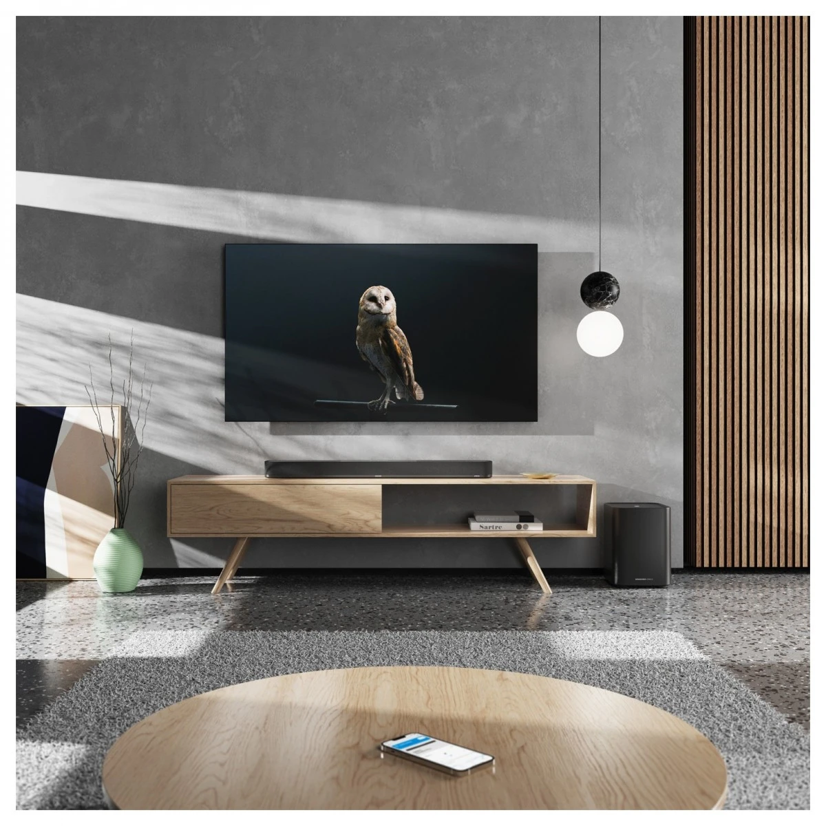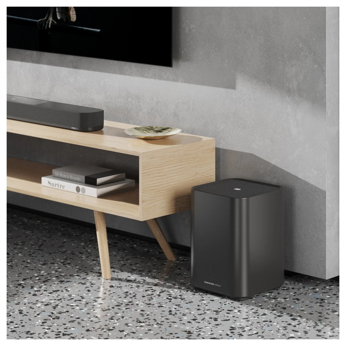 - State-of-the-Art -AMBEO- virtualization technology, co-developed with the Fraunhofer IIS Institute, delivers extremely deep bass.