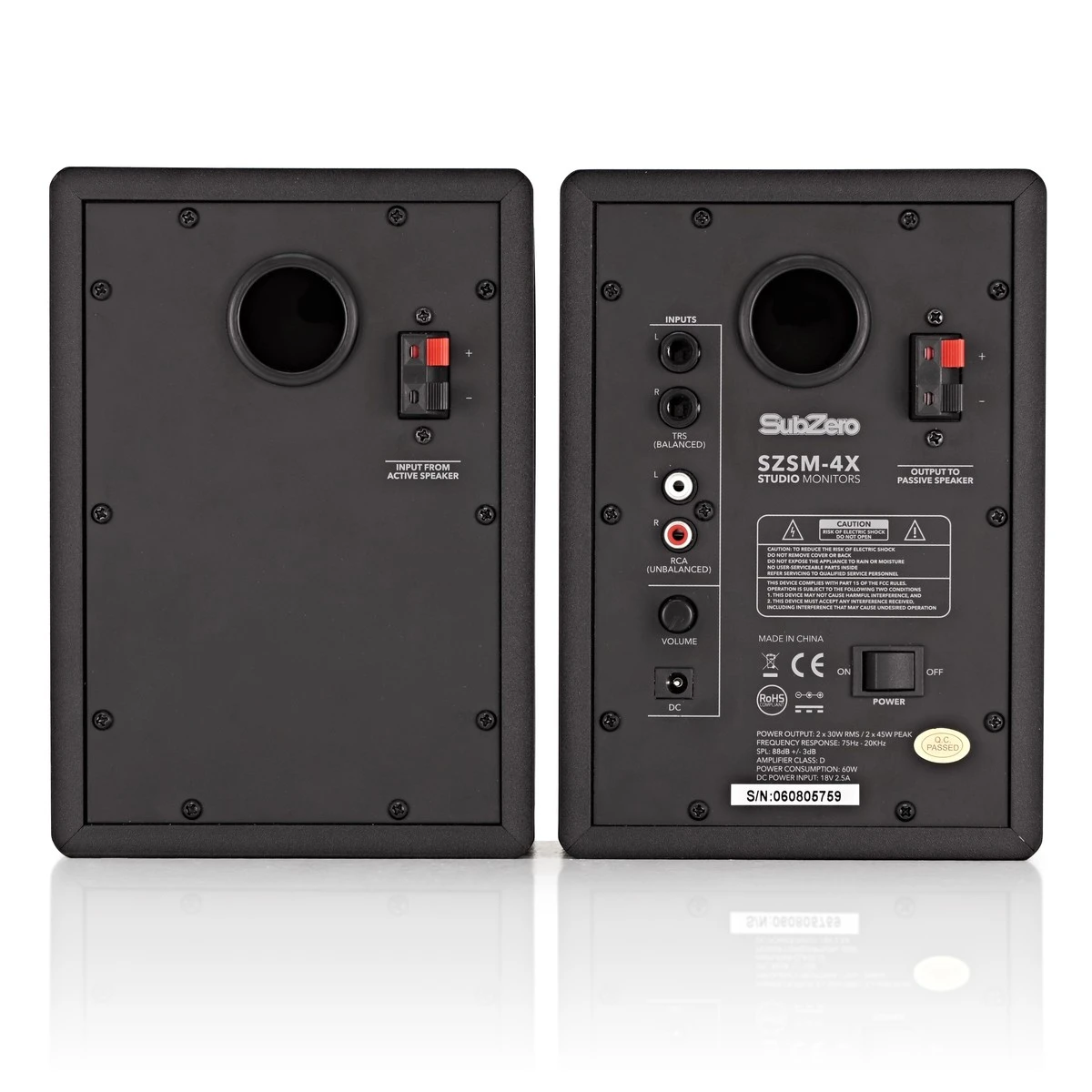 You’ll be provided with a hybrid set up of one active and one passive monitor. The SZSM-4X pair feature 4″ drivers with a magnetically shielded mineral-filled polypropylene cone with a high temperature voice coil and a dampened rubber surround. This will provide you with an even, punchy low end, even at high volumes. Combined with the 3/4″ magnetically shielded ferrofluid-cooled natural soft dome tweeter and the 2.7KHz crossover, these monitors will give clear and reliable sound, time after time.