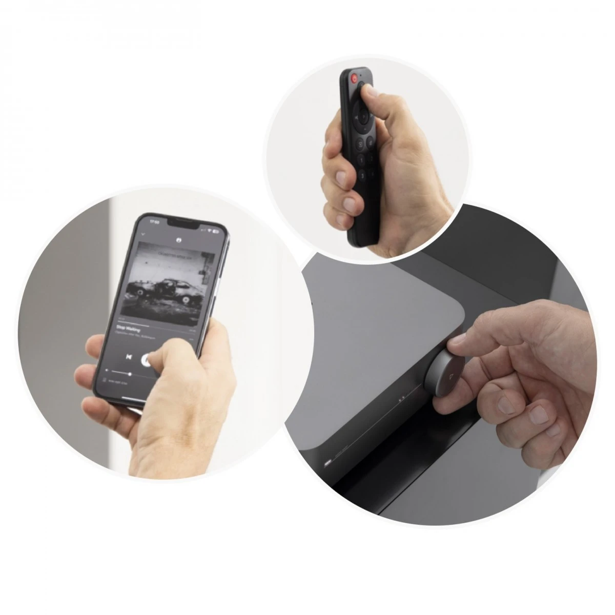 - Control via the WiiM Home App or with the voice command remote included with this amp